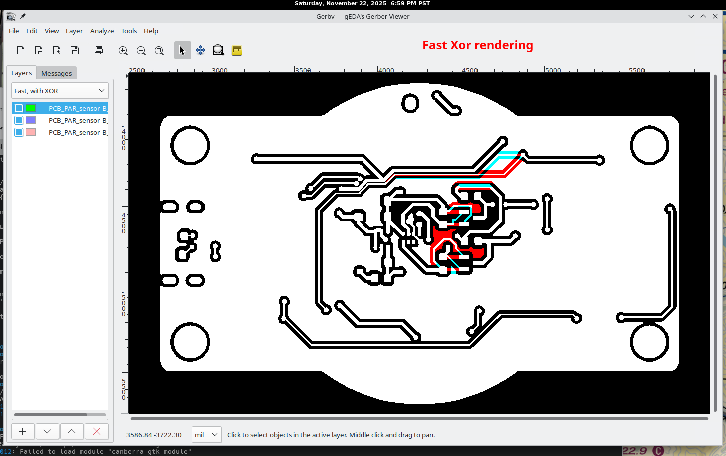 There are about 10 Gerber files for each export, so with three differing versions, there would be 3 sets of 10 files to compare, it would take a couple of hours just to load the individual files into the program Gerbv[iewer], then set the color and opacity. With ChatGPT, I created a Perl script that does all of that so all I have to do is point to the three directories containing the Gerber exports and my Perl scripts will launch Gerbv and will create 10 SVG [scalable vector graphics] files and then an HTML page to display them. Here is a PDF of the 10 images: Gerber Comparison Results – 20251122_194254
