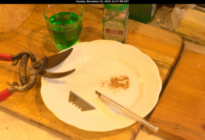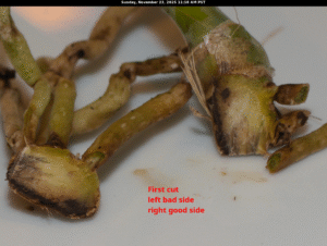 I set up a sanitary surgery area in the kitchen and sterilized the tools. Then I proceeded with cuts and took photos along the way. I immediately undertook a surgery to isolate the healthy tissue from the decaying plant. As I made cuts, I shared them with ChatGPT for its assessment of the tissue condition. Several cuts had to be made — it was like mohs surgery, except on a rhizome. Here’s the first cut portions after I isolated what I felt was rescuable from the plant: