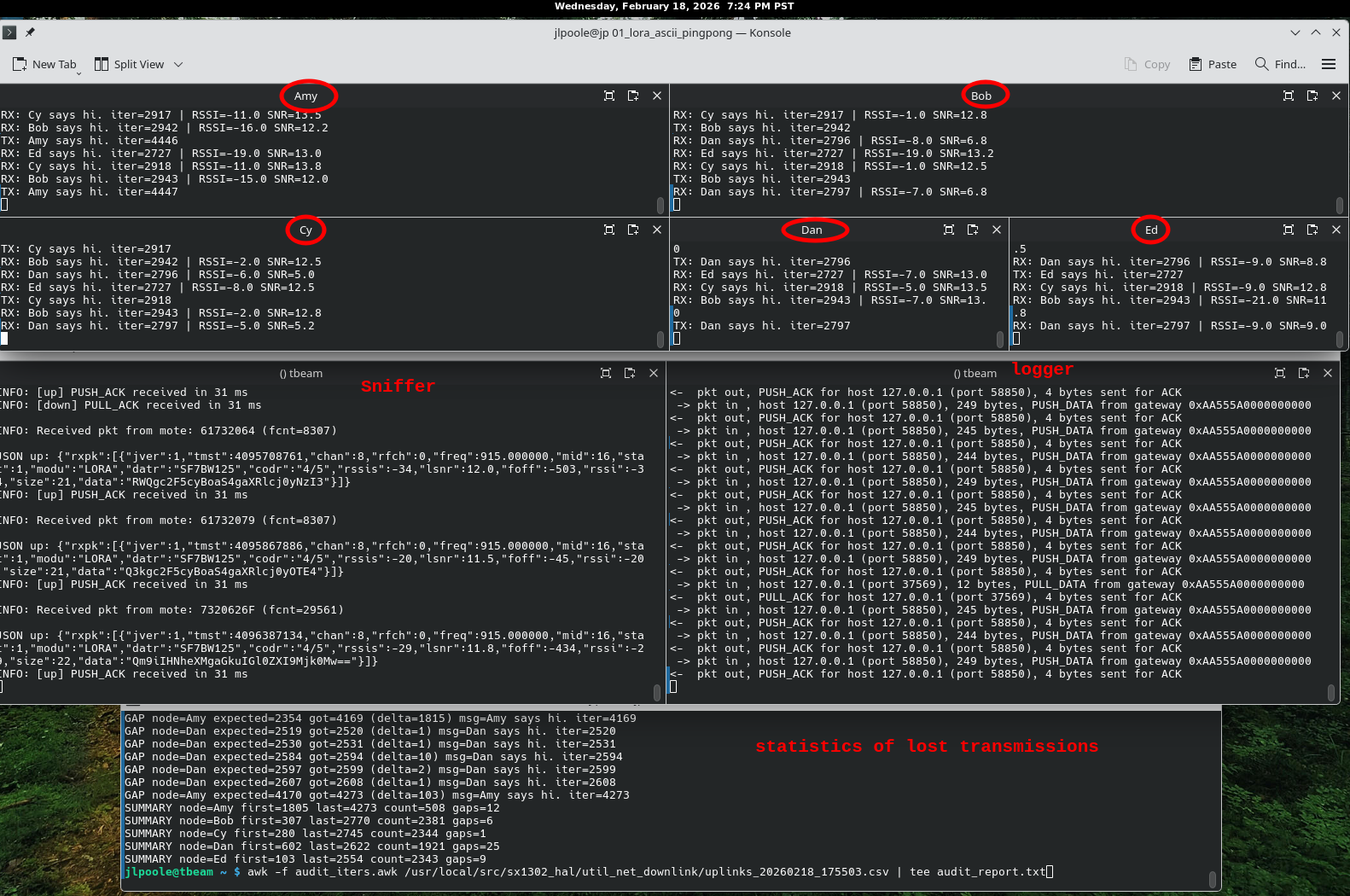 I also have a Lora sniffer using the Semtech 1303 chip on a separate Raspberry Pi server which can capture up to 8 simultaneous transmissions. Then I have a logger which preserves what the sniffer found. And then I have an awk script which traverses the log and determine where there are gaps in transmission, i.e. lost packets, collisions.