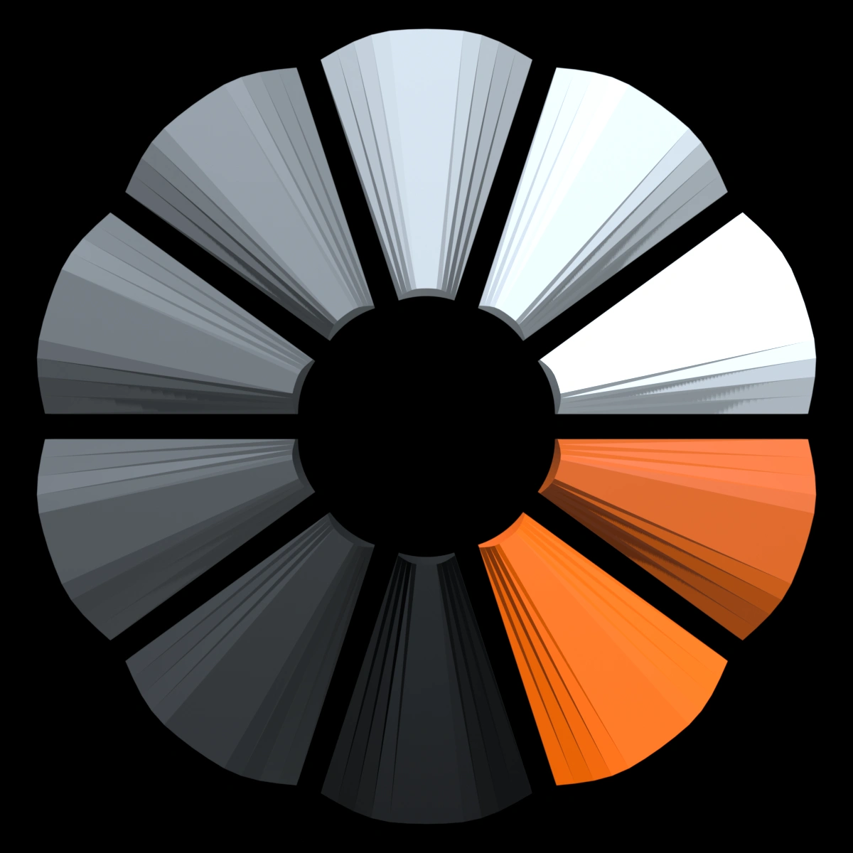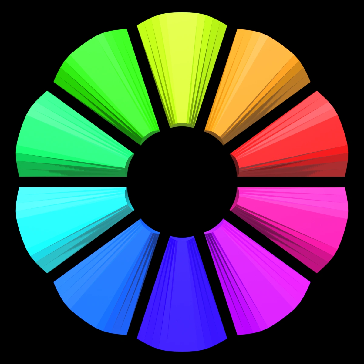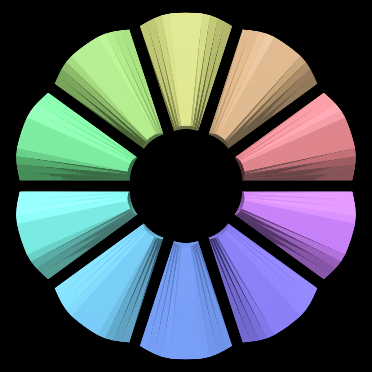 The OpenSCAD model is exported into STL, and then with Blender, I can specify 10 colors and each wedge will inherit a color in the GLB files.