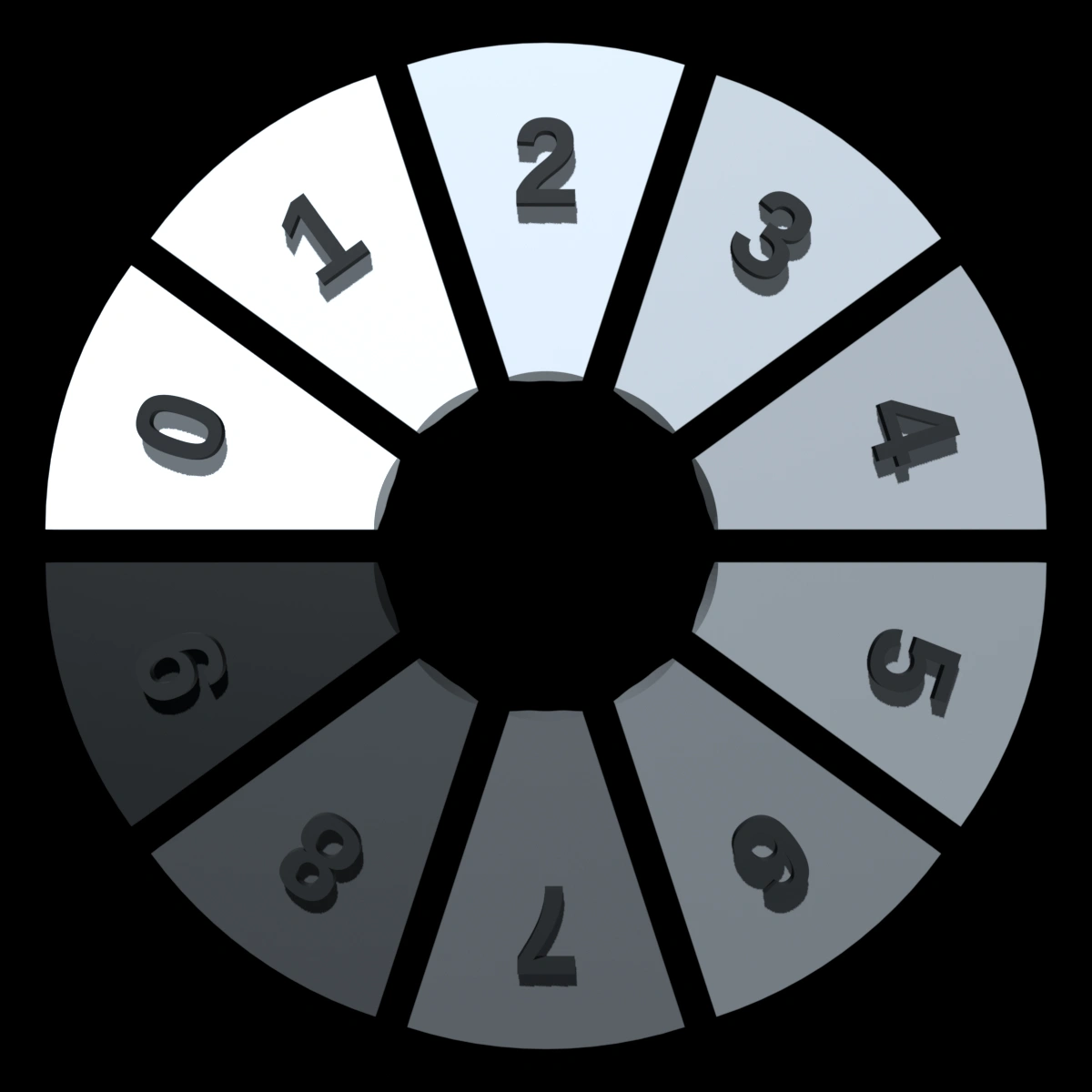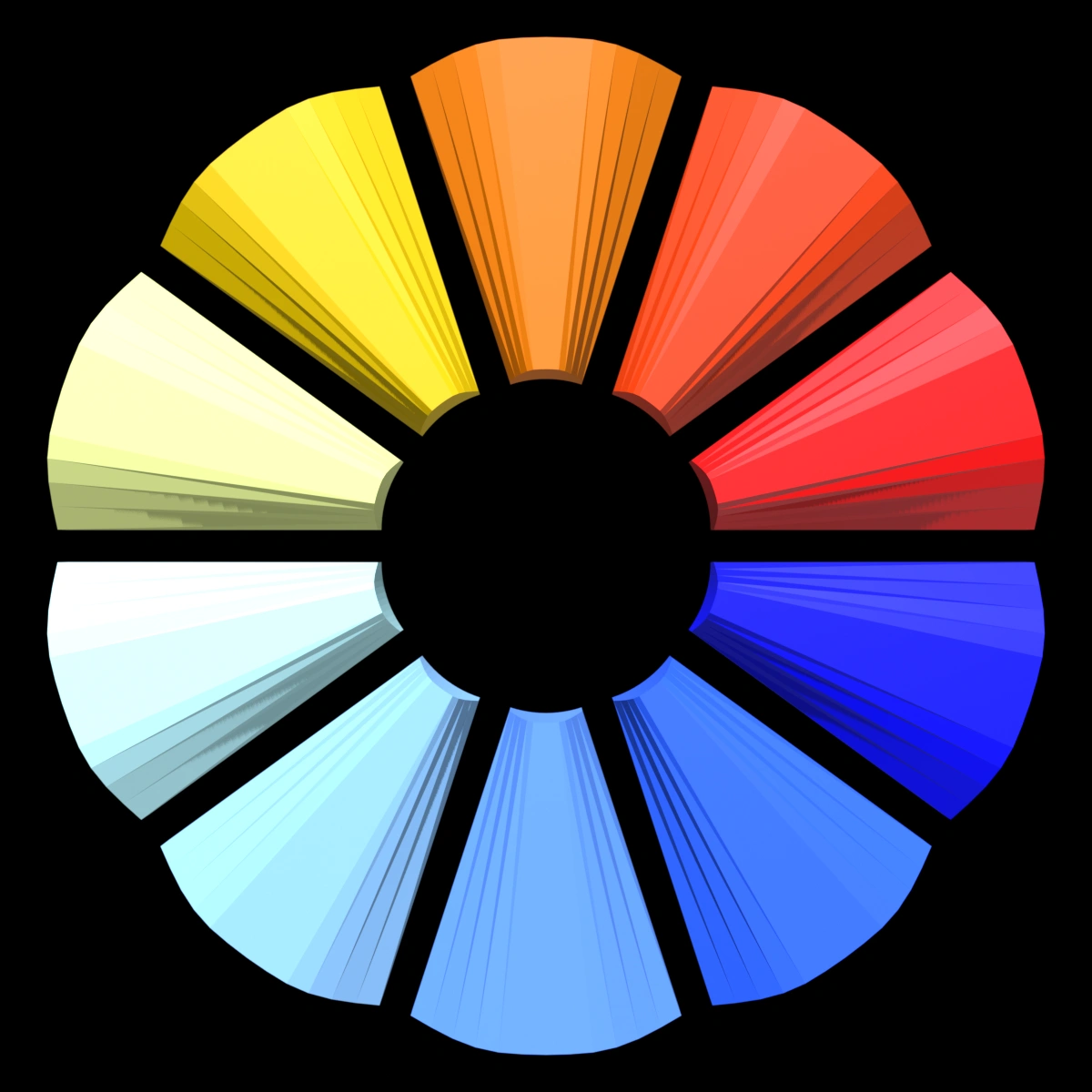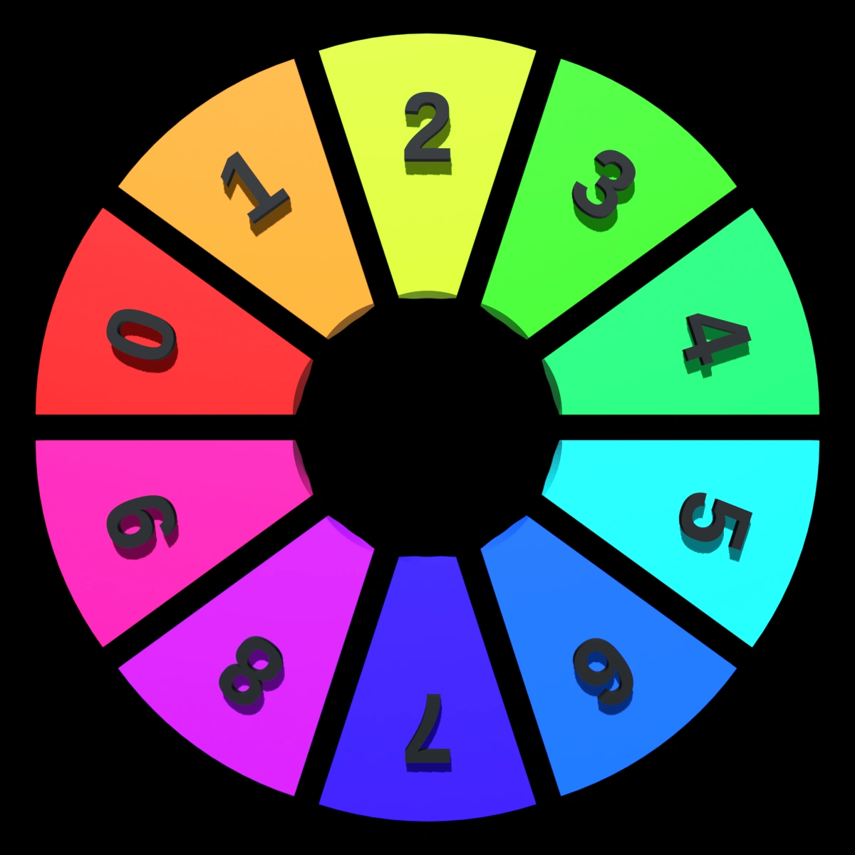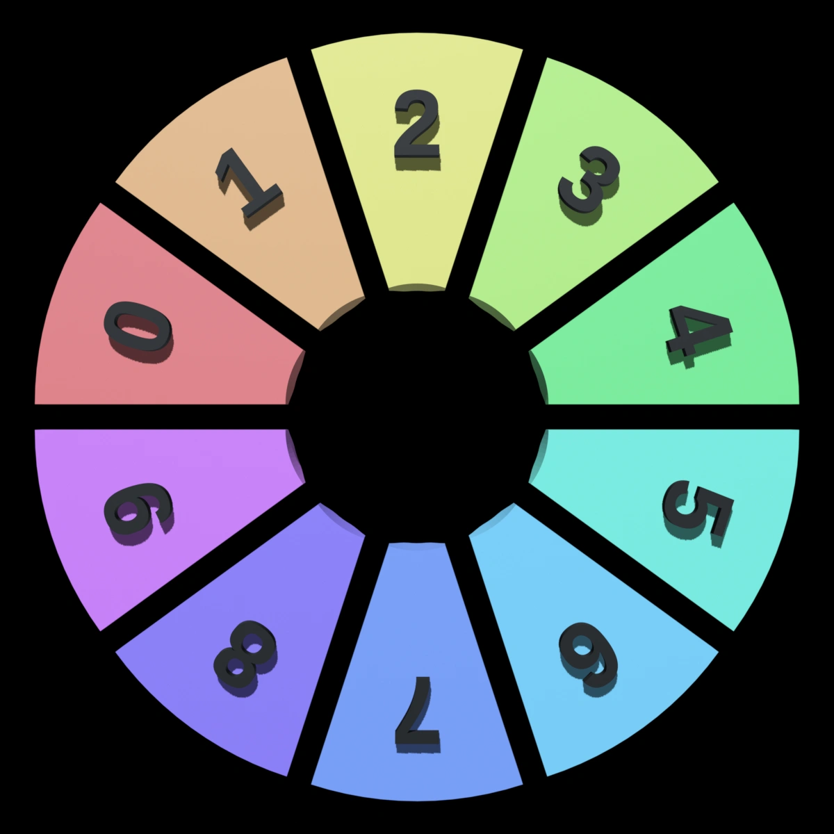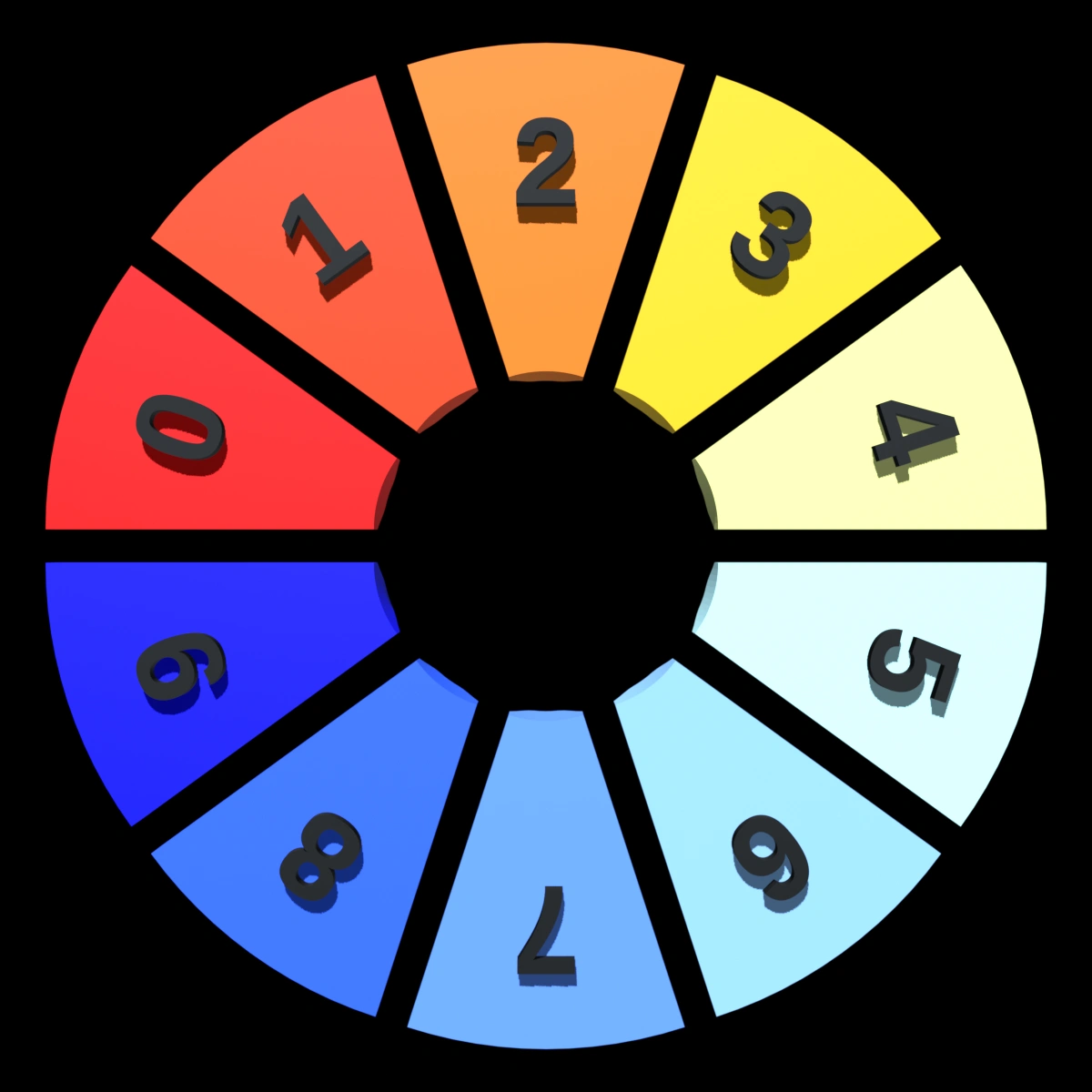 Here’s a pie chart example specifying a wide range of colors. The numbers are on the bottom of the wedges so you can see how much color varies depending on the angle of view. For instance the red, “0”, appears much lighter when looking at the faceted wedge from the top.