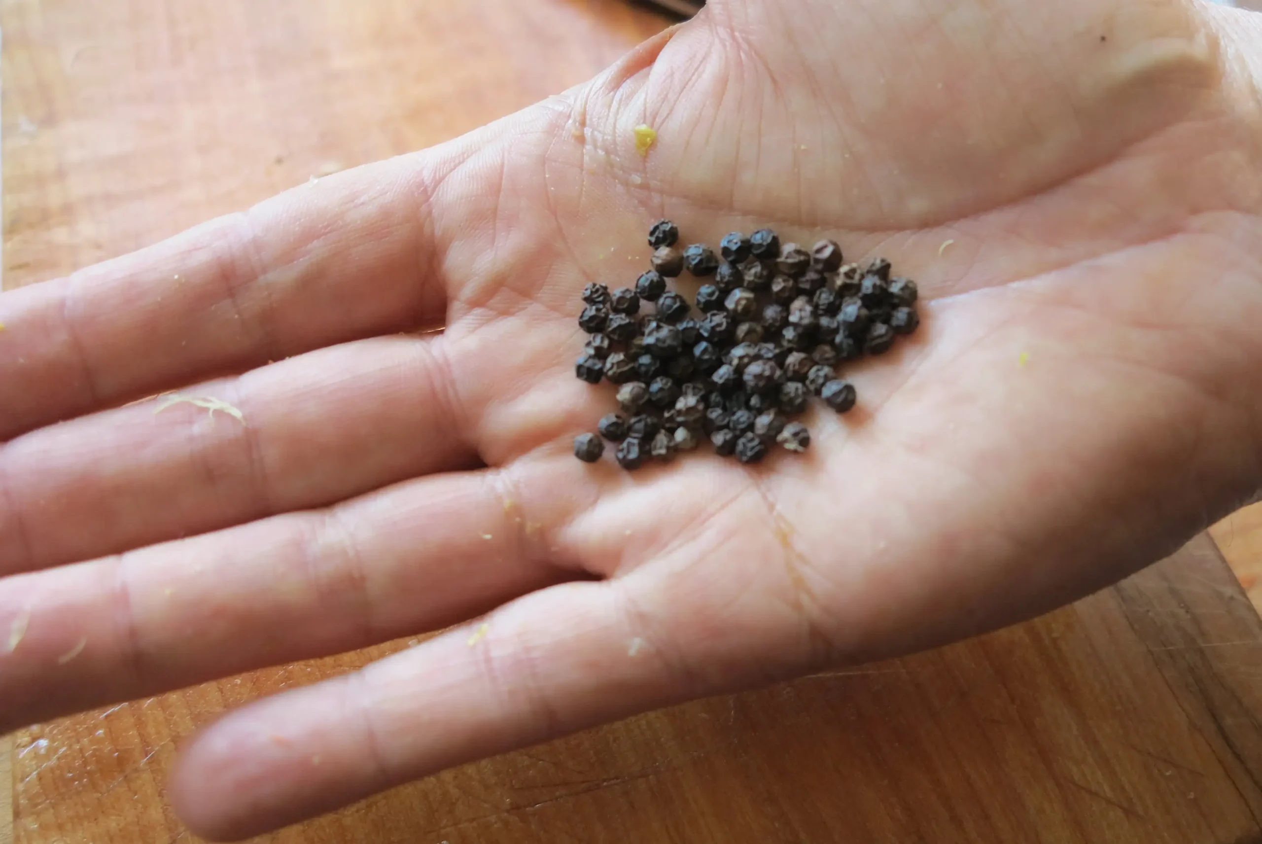 And then if your arithmetic is limited, or your ability to make an eyeball count of peppercorns, then might consider not making 7 recipes worth at one time. Here I poured some peppercorns into my hand and gallantly announced to my wife that it was my estimate there were about 35 peppercorns. 7 recipes calls for 70 peppercorns, so I poured another slightly lesser amount and tossed the two hands’ worth of peppercorns into the pot pell-mell. We took a photo, and later seated at my desk, I started a count of this picture of the first handful, and lo, there are over 70. So, this batch can be labeled spicy since it probably has double the amount of peppercorns.
