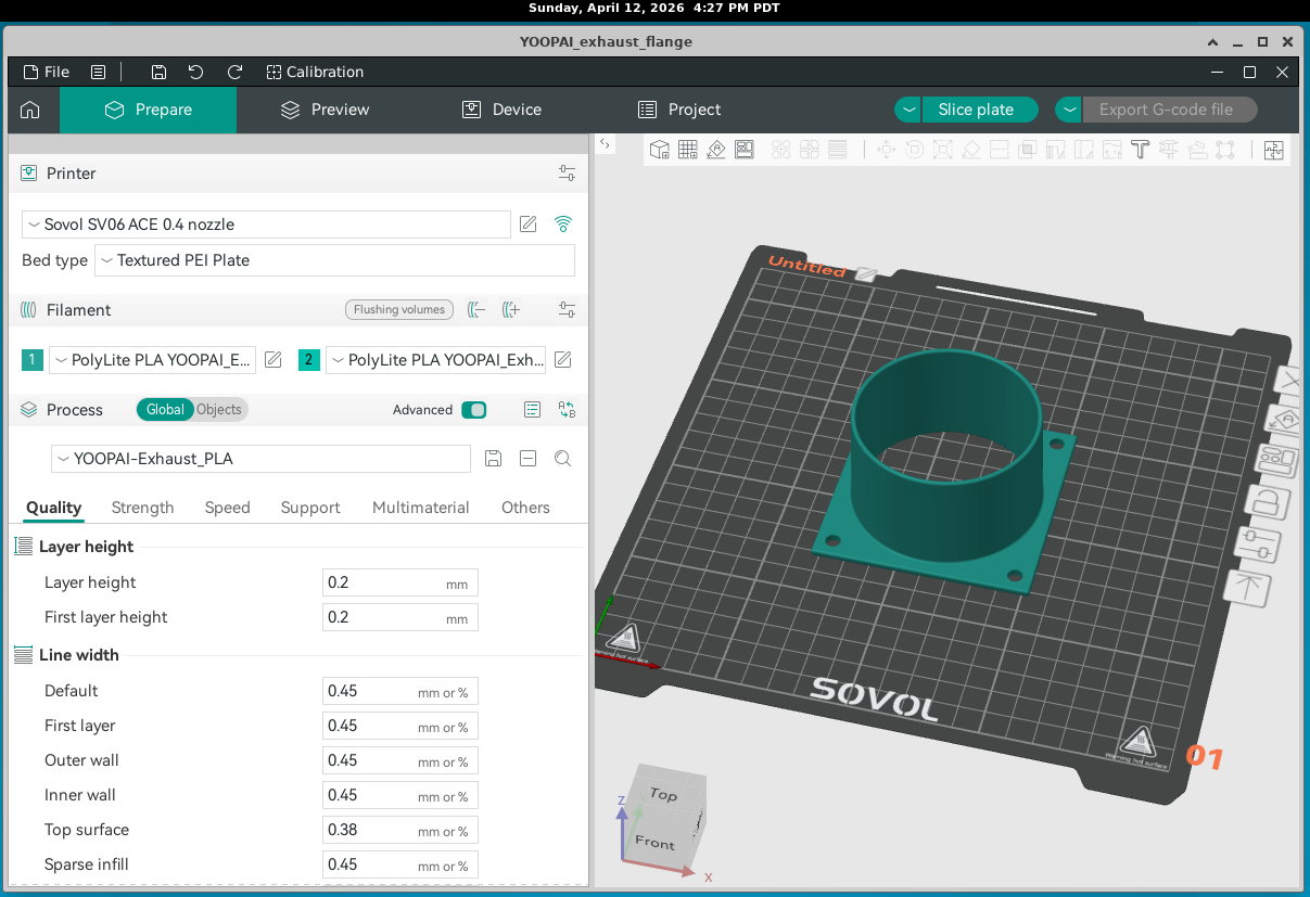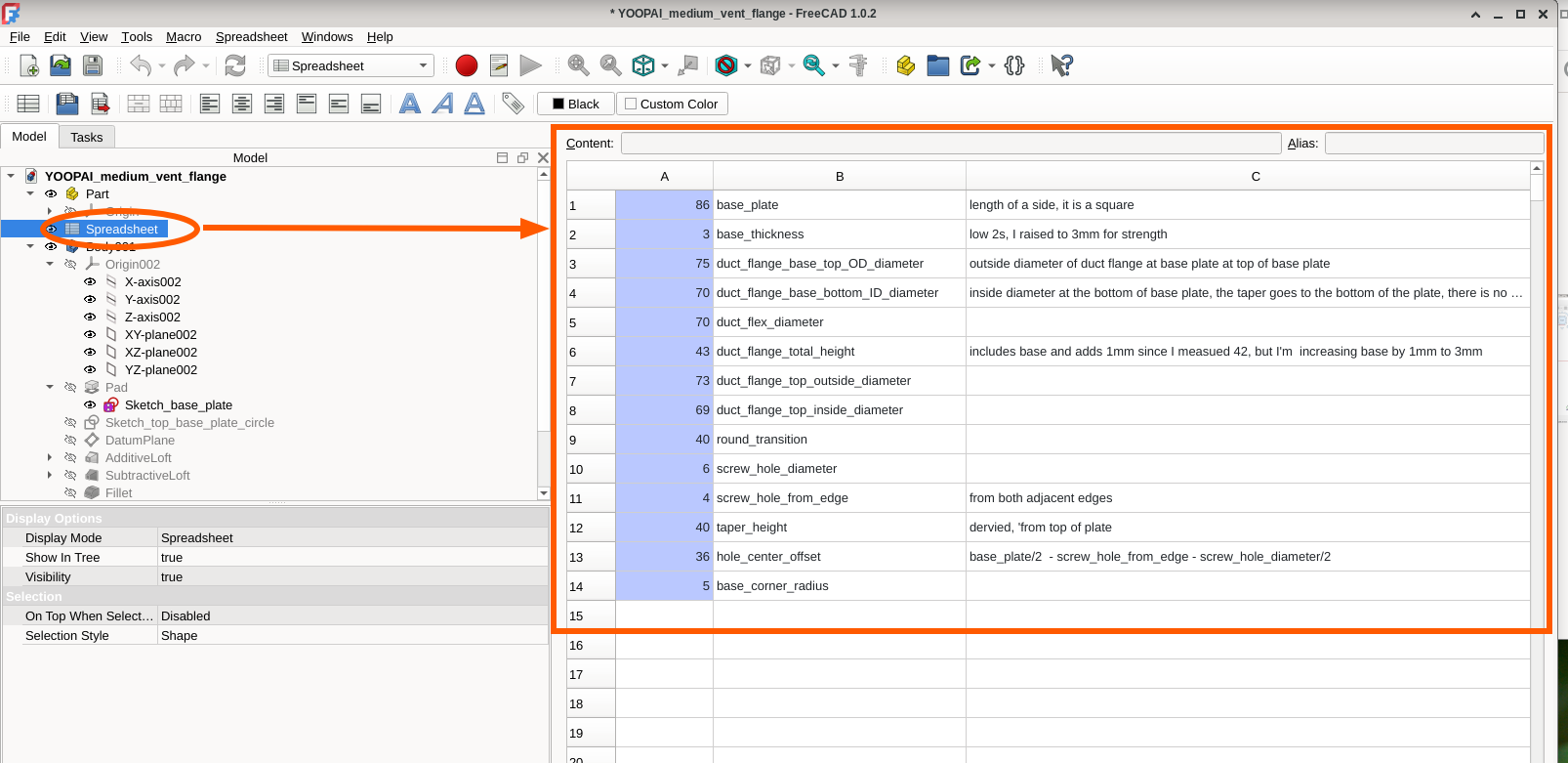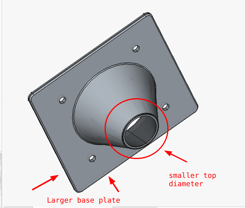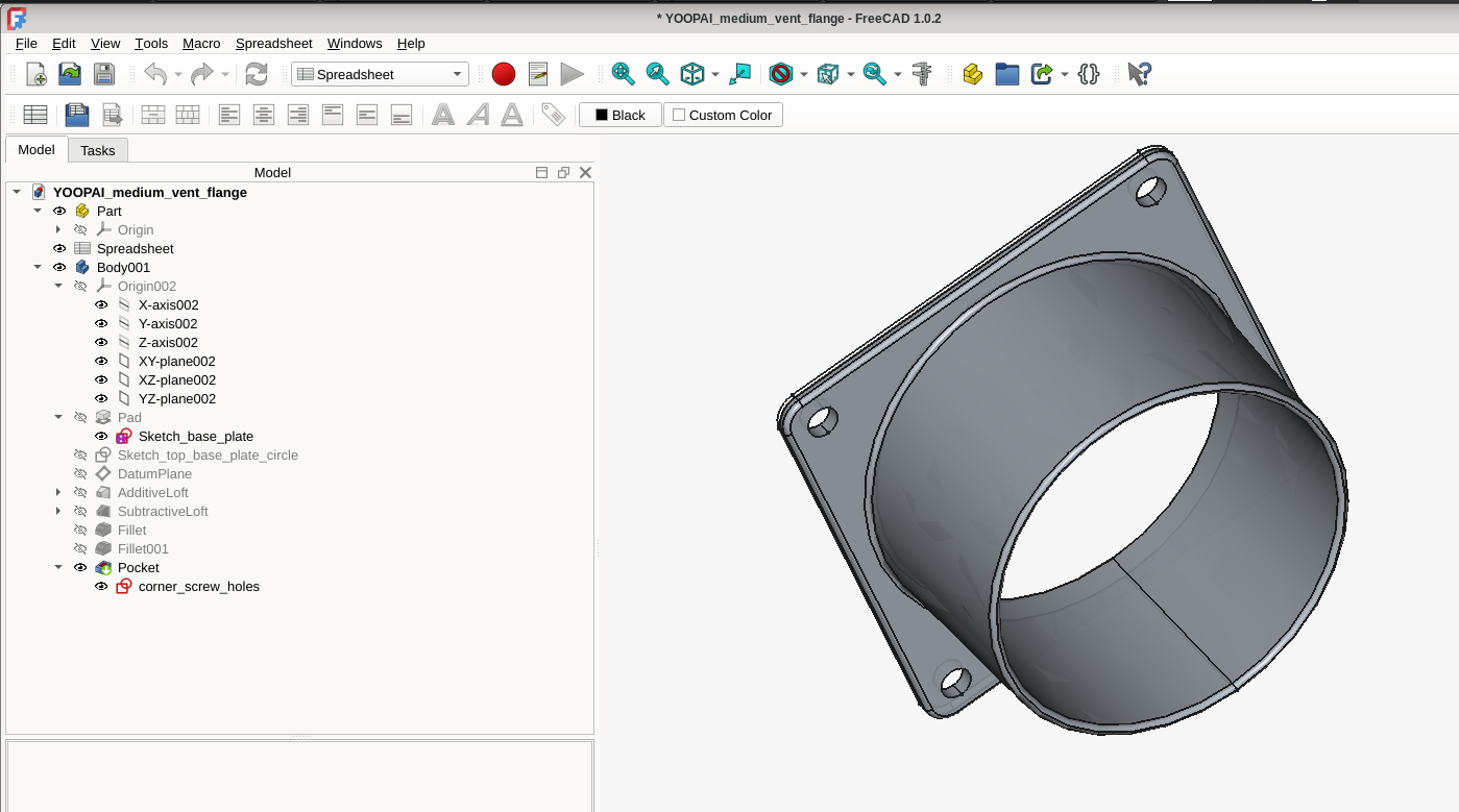 The kit provides a flexible duct (the black duct on the right) — what you do at the other end of the flexible duct is up to you. So I decided I would build a transition that the flexible duct would fit over and then the other side could be affixed to a board which fits under a double-hung window. I used the included YOOPAI transition from the fan to duct as a model to duplicate in the 3D drawing in the software FreeCAD (free and open source). This served as an excellent exercise to create a model in FreeCAD and have a finished product to compare with. Working in and learning FreeCAD was a struggle, and it consumed a lot of time as ChatGPT was out of date with the software and FreeCAD’s changes to tools were not in ChatGPT’s ken. I also have my prejudices from 30 years of using other design software and as a software programmer. After several days, I finally was able to model a duplicate of the YOOPAI transition.