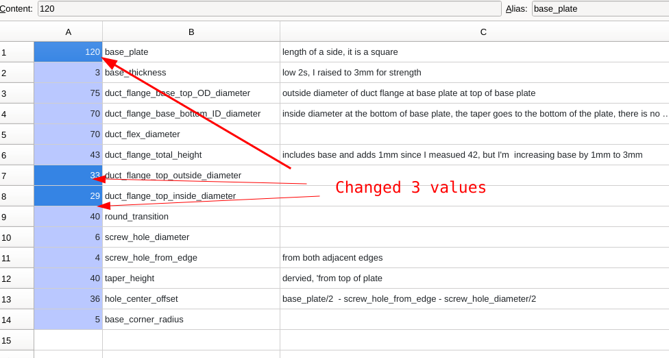 For example, the current plate dimension is increased to 120mm from 86mm and the top of the cone reduced (73 -> 33 & 69 -> 29), here the model is instantaneously and faithfully created with the changes.