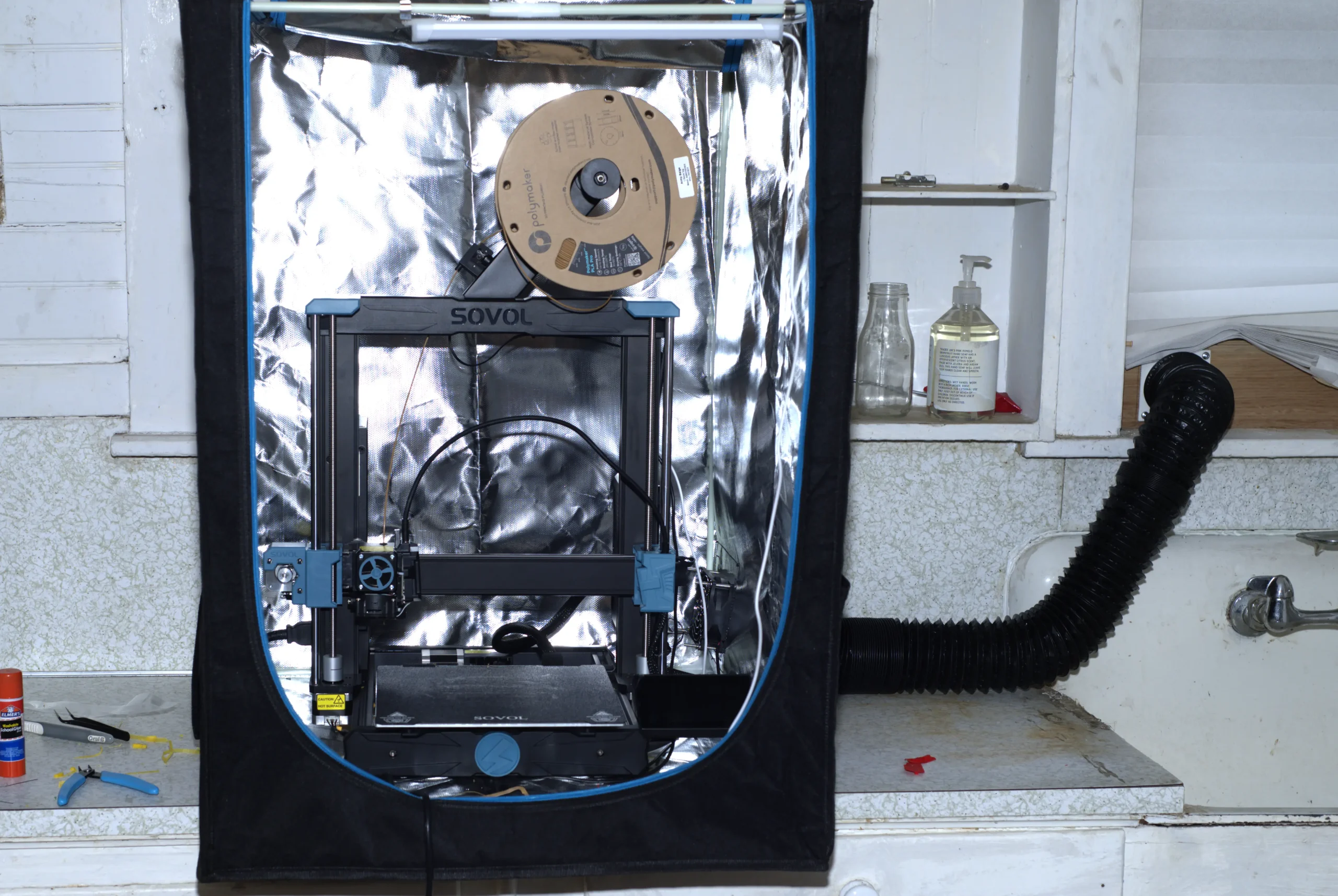 Here’s a photo of the YOOPAI “3D Printer Enclosure with Ventilation Kit” with my SV06 printer inside and the duct leading to the newly built duct flange attached to a board fitting in a double-hung window casement.